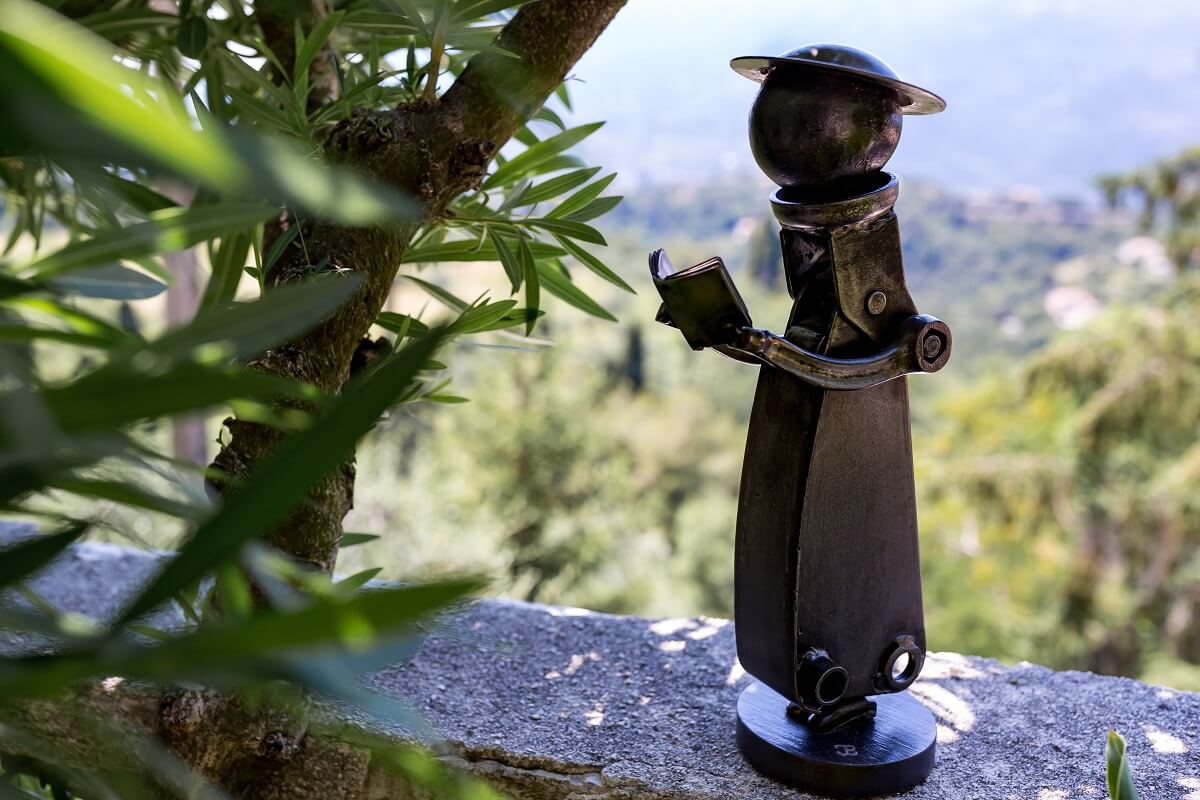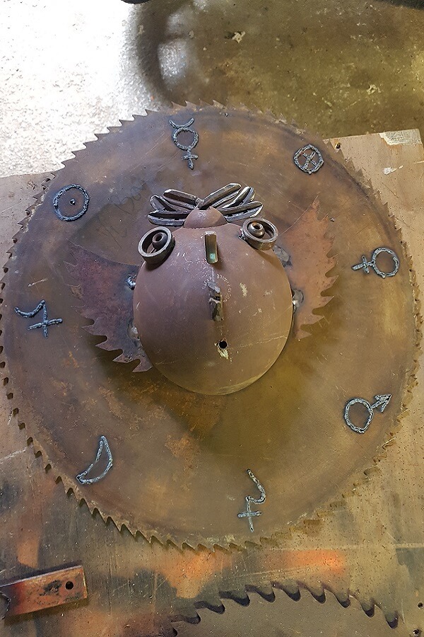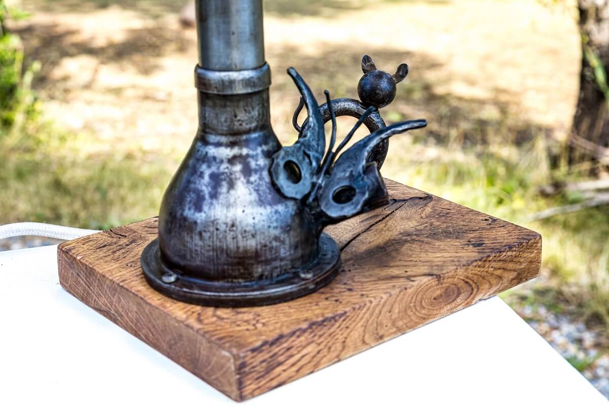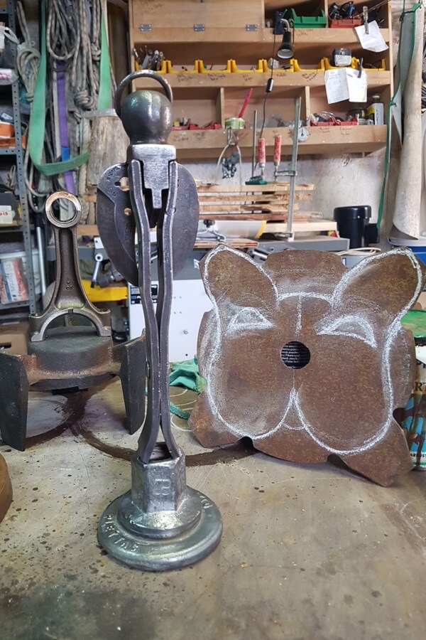Pour cela, je chauffe, je tords et soude de vieux outils et ustensiles du quotidien. J’assemble toute sortes de matériaux en essayant de conserver leur forme, sans trop les dénaturer.